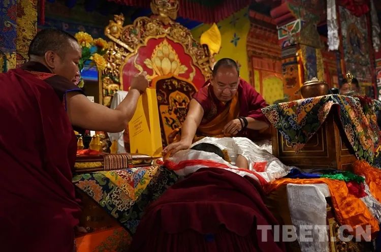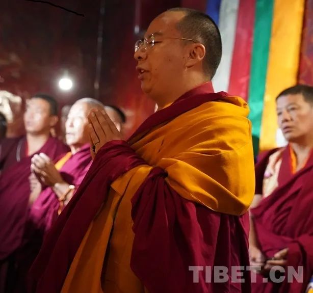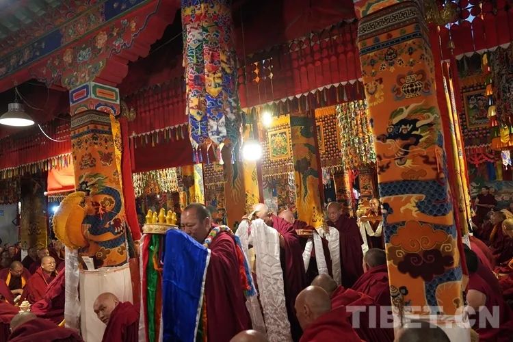 法号齐鸣、法锣合奏,众僧以隆重的宗教仪轨迎接班禅。班禅抵达藏传佛教格鲁派祖寺甘丹寺后在僧众的簇拥下,先后步入羊坚多康殿、宗喀巴大师灵塔殿、十八罗汉殿朝拜、诵经、敬献哈达。