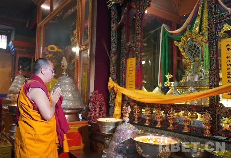 图为班禅在羊坚多康殿波米仁波切灵塔前诵经祈祷 摄影:王淑