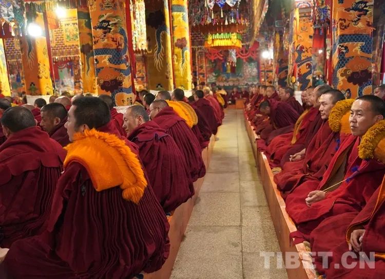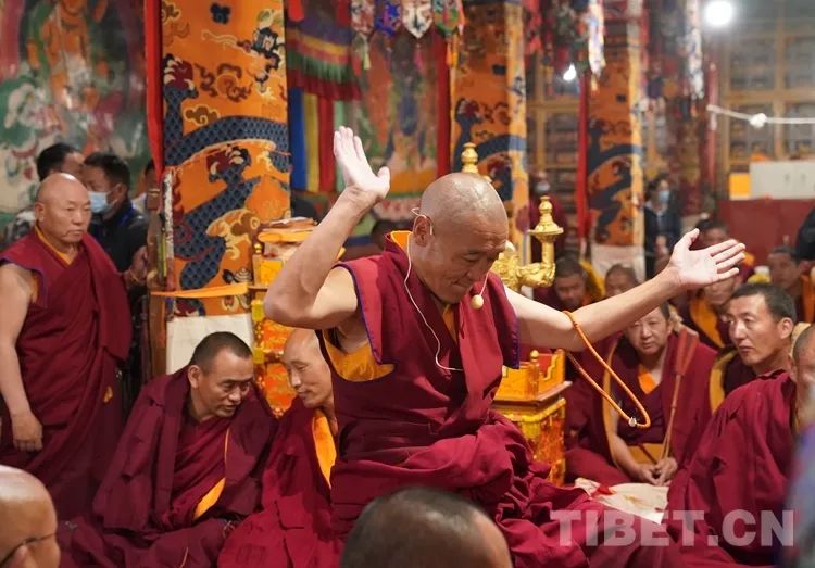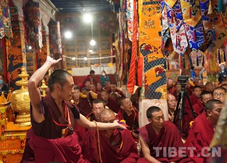 朝拜结束后,班禅步入甘丹寺夏孜扎仓,现场观摩2023年度西藏自治区藏传佛教学经僧人晋升格西拉让巴学位夏季预考活动。