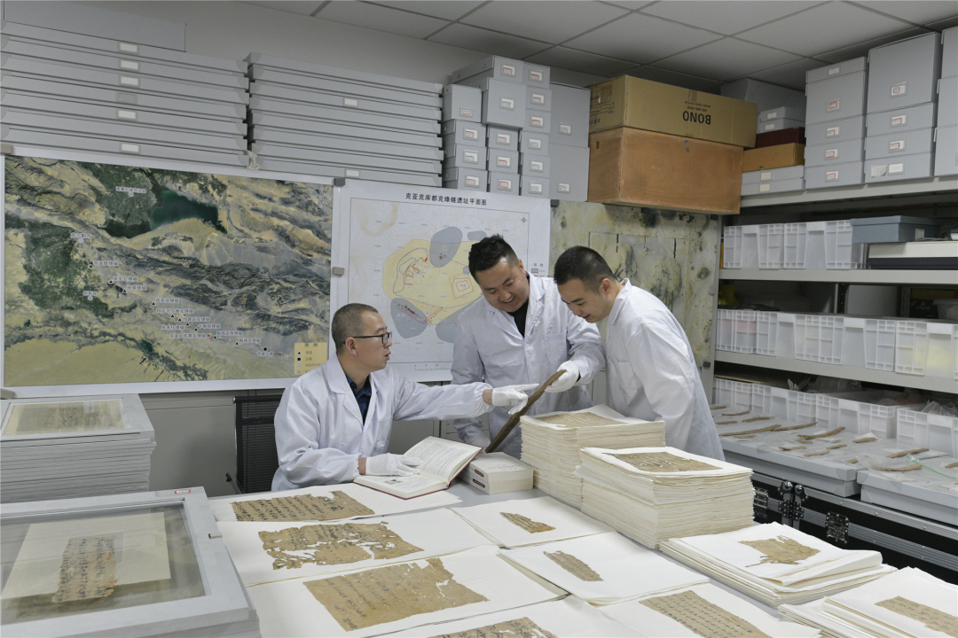 ▲新疆克亚克库都克唐代烽燧遗址考古人员在室内整理文书。胡兴军供图