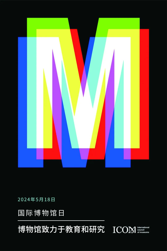 2024年“国际博物馆日”主题海报以深邃的黑色为背景,以多种鲜明色彩展现博物馆标志性字母“M”,象征着博物馆向世界传授的多元化知识谱系。抽象的构图则是一种视觉上的隐喻,意为博物馆贮藏着浩繁信息,等待人们的探索和分享。
