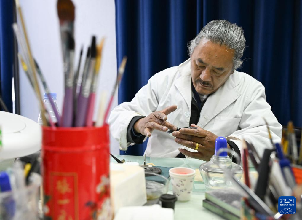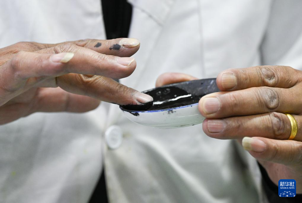 布达拉宫贝叶经实验性修复小组实验室工作人员对用于贝叶修复的颜料进行研磨处理(5月25日摄)。新华社记者李贺摄