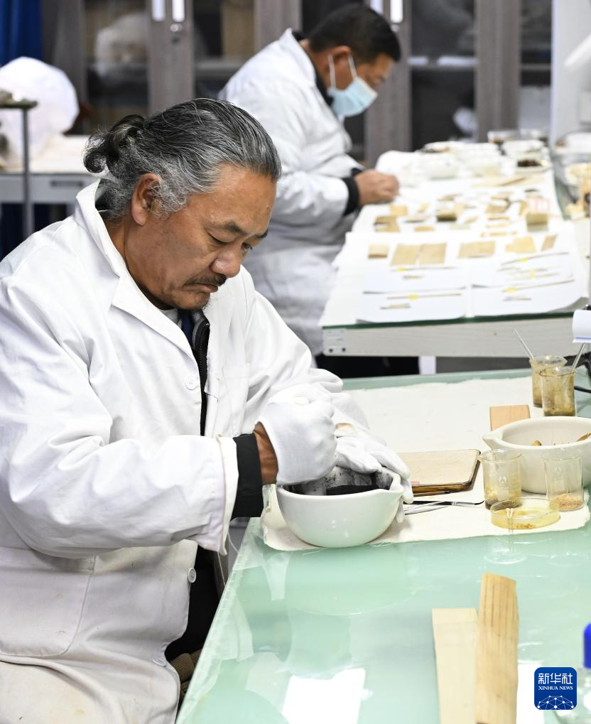 布达拉宫贝叶经实验性修复小组实验室工作人员对用于贝叶修复的颜料进行研磨处理(5月25日摄)。新华社记者旦增尼玛曲珠摄