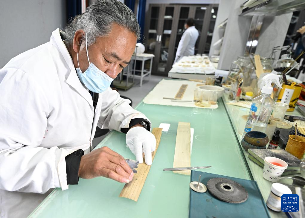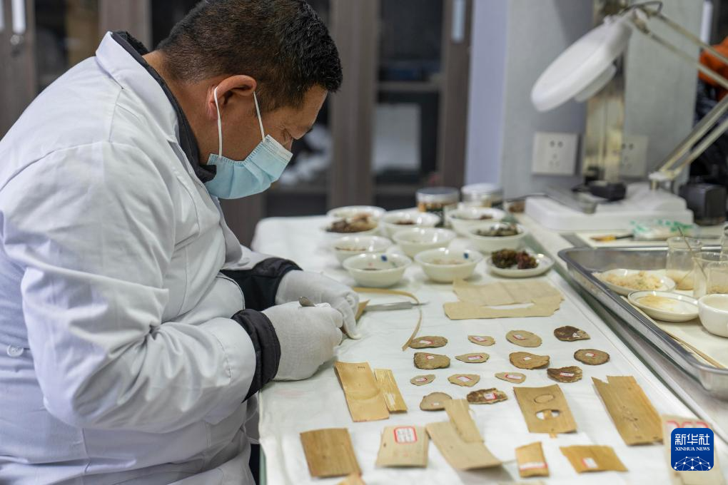 布达拉宫贝叶经实验性修复小组实验室工作人员对贝叶进行处理(5月25日摄)。新华社记者旦增尼玛曲珠摄