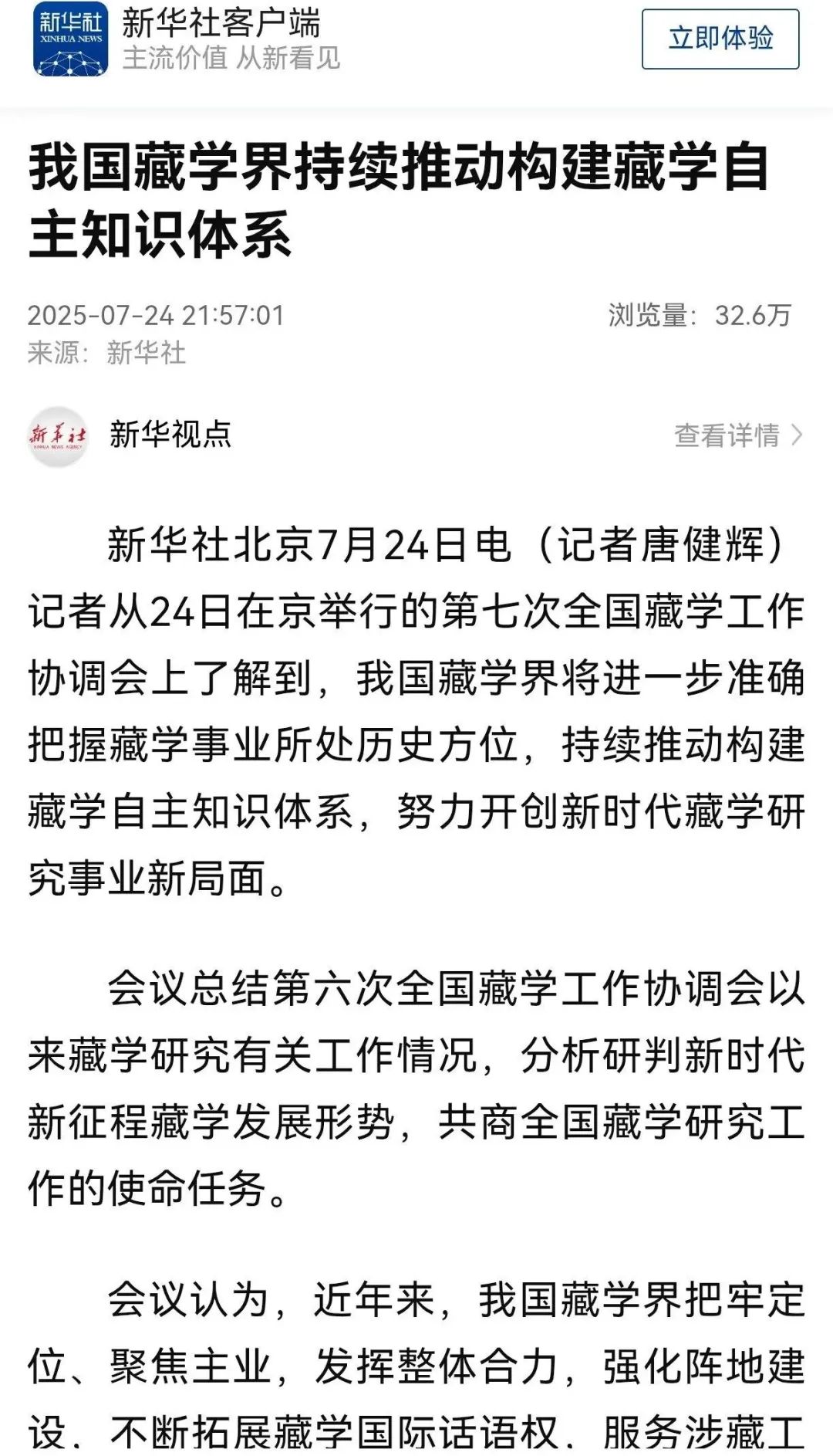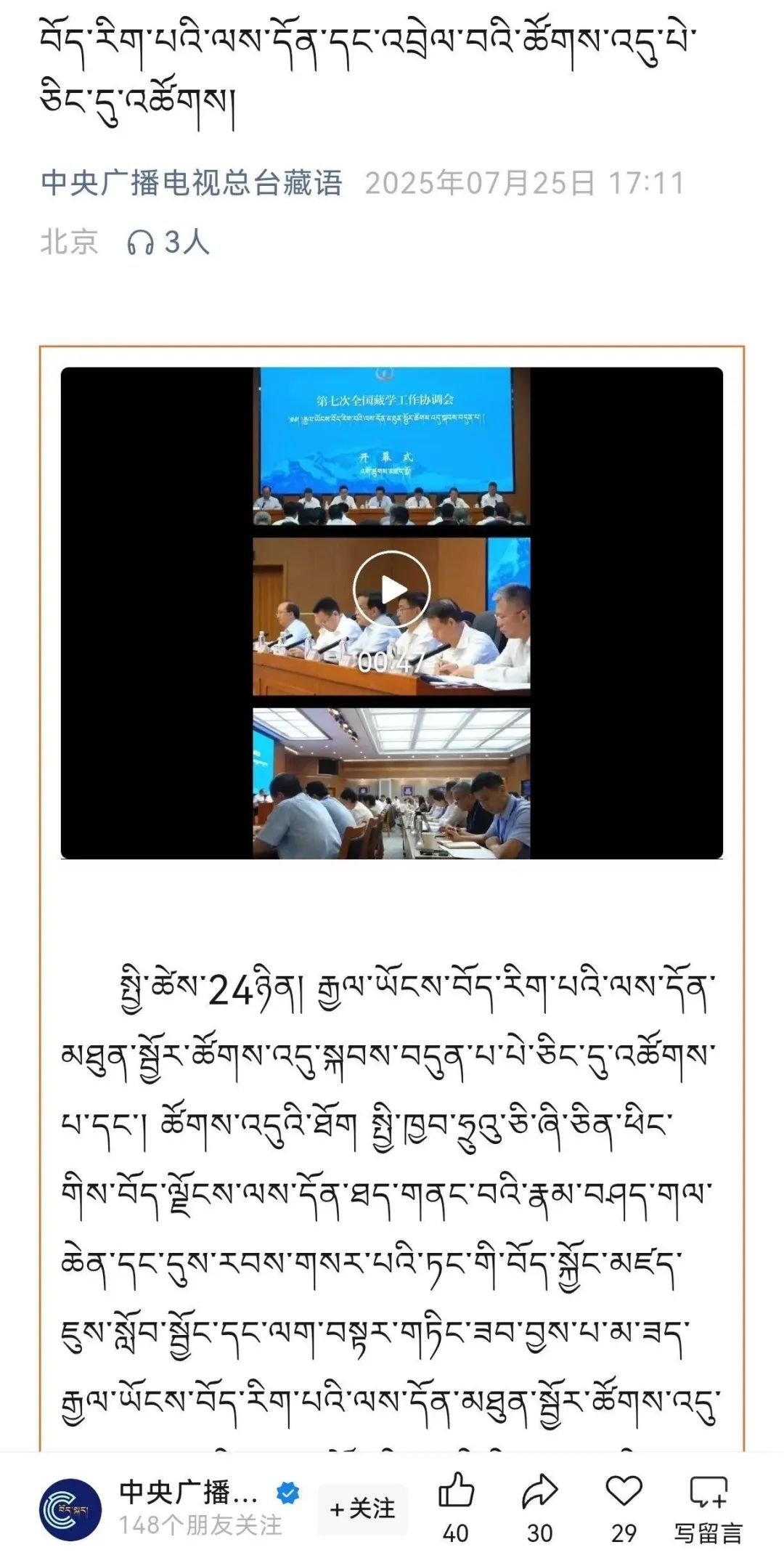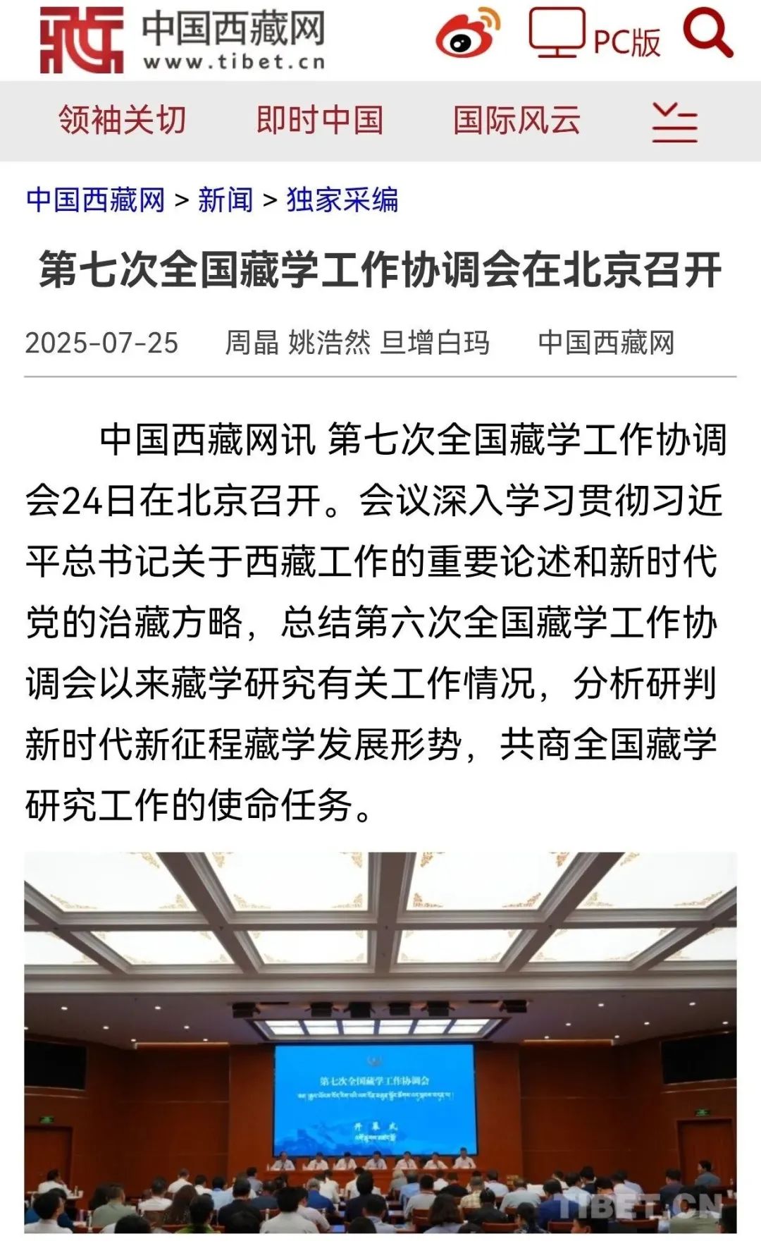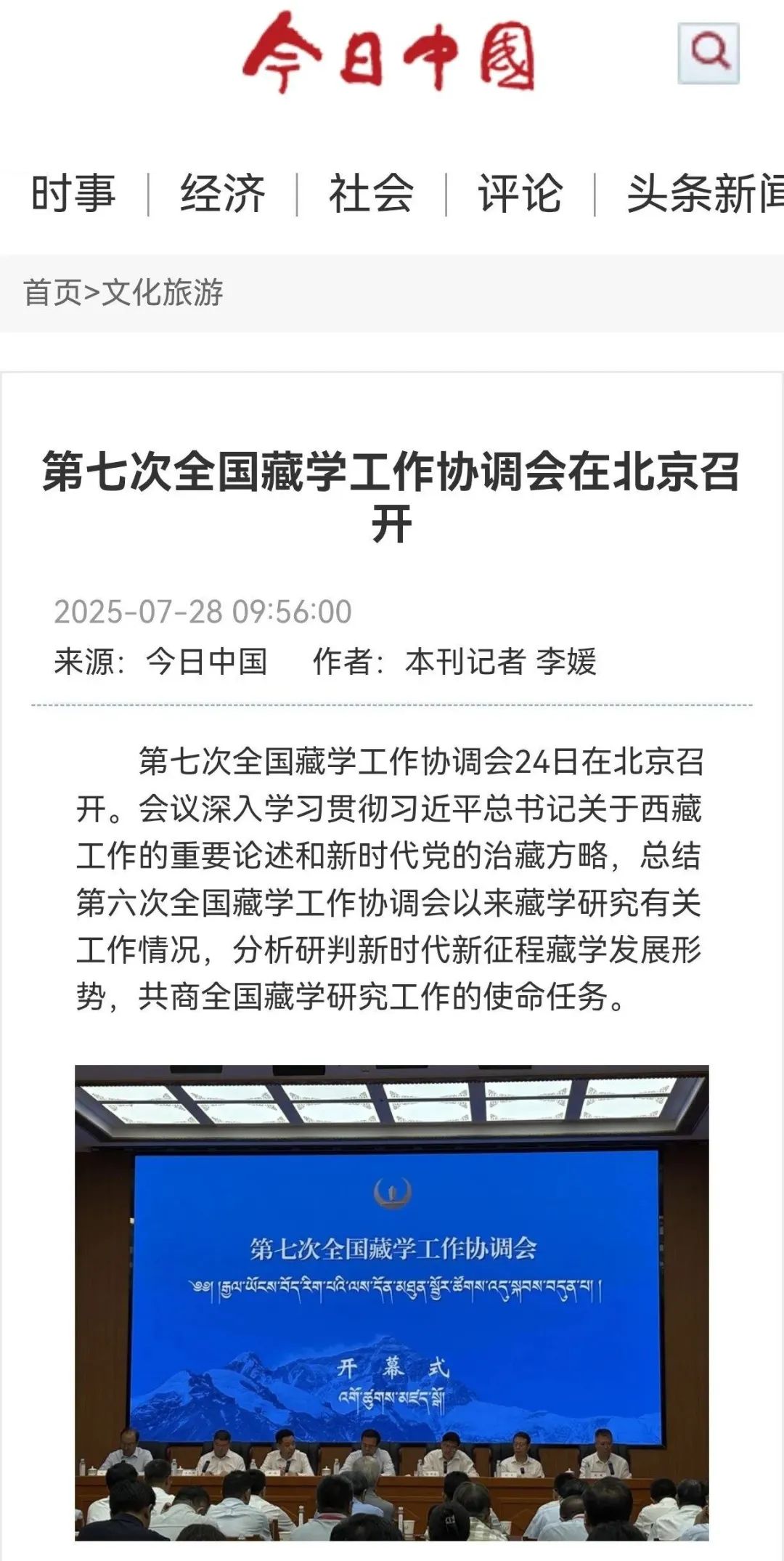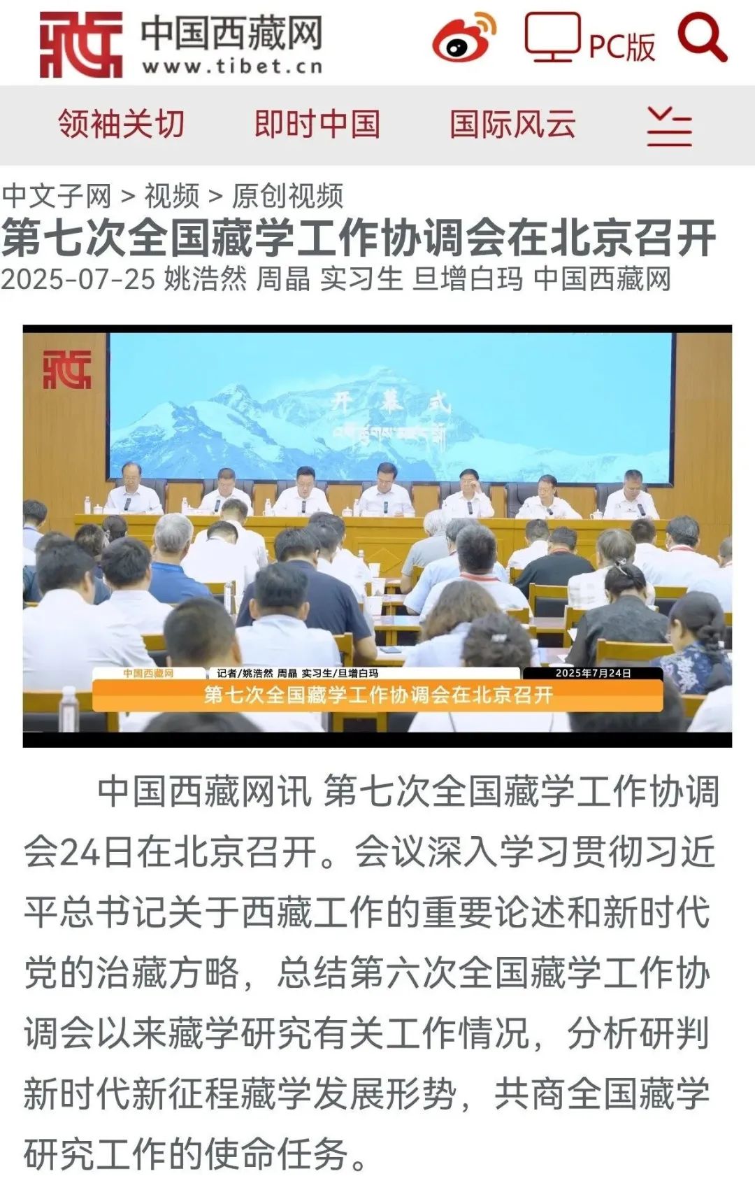 7月24日,第七次全国藏学工作协调会在北京召开。近日,人民日报海外版、新华社、央视新闻、光明日报、人民政协报、中国新闻社、中国青年报、中国网、央广总台中国藏语广播网、中国西藏网、西藏在线网、今日中国等主要媒体,运用文字、图片、视频等多种形式,集中对本次会议进行全方位报道,展现了广大藏学工作者始终把牢藏学研究的正确政治方向,以更强的战略意识提升服务党的涉藏工作能力和水平,积极探索构建涉藏对外交流和国际传播新机制,不断激发创新活力,奋力书写藏学工作新篇章的生动实践。