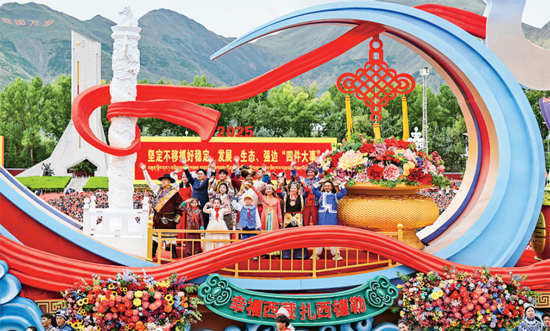 2025年8月21日上午,西藏各族各界干部群众约2万人欢聚拉萨市布达拉宫广场,热烈庆祝西藏自治区成立60周年。图为游行的彩车通过布达拉宫广场。新华社记者谢环驰/摄
