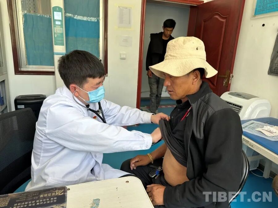 图为河北省定州市人民医院援藏医生边晨峰在西藏为病人检查