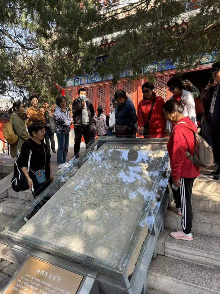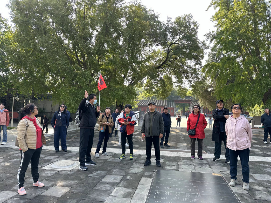 秋雨初霁,碧空如洗,枫叶流丹,秋阳泻玉。老同志们漫步在千年石刻与艺术珍品之间,聆听专业讲解,品味历史脉络。他们在太学院遗址前驻足细观明代石刻的雄浑气韵,在万寿寺殿宇间沉醉于传统建筑的匠心独具。