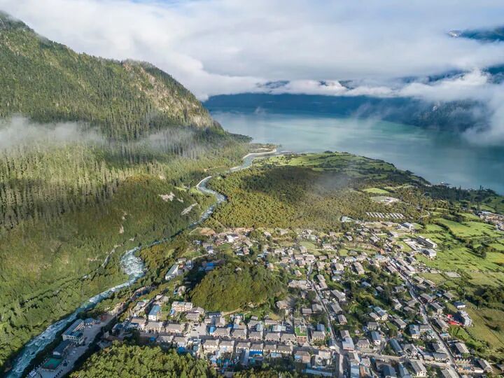 这是2023年7月20日拍摄的西藏林芝市工布江达县错高乡结巴村景色(无人机照片)。新华社记者孙非摄