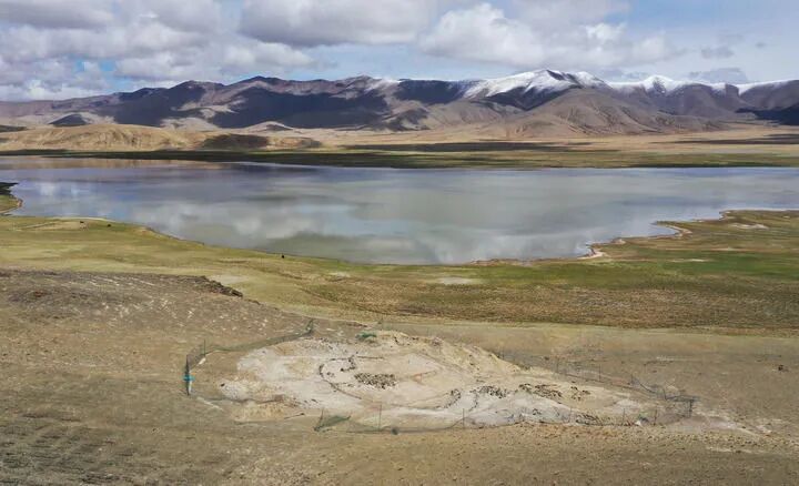 这是2025年5月22日拍摄的坐落在玛不错湖畔的遗址第四期石构地面建筑考古发掘现场(无人机照片)。新华社记者李贺摄