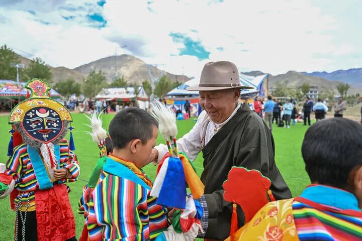 2025年7月16日,76岁的湘巴藏戏国家级非遗传承人次仁多吉(右二)在西藏南木林县非遗公园内给即将表演湘巴藏戏的小演员整理服装。新华社记者李鑫摄