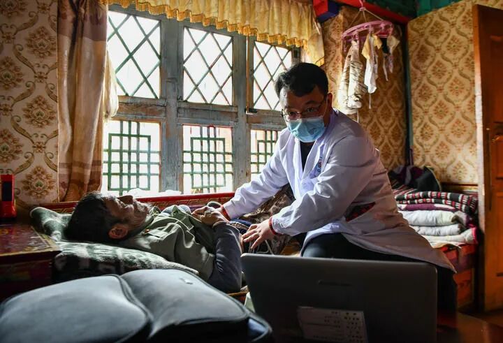 2023年6月12日,广东珠海市人民医院第七批援藏医疗队王旭彤医生在给西藏米林市吞不绒村患者珠杰检查身体。新华社记者晋美多吉摄