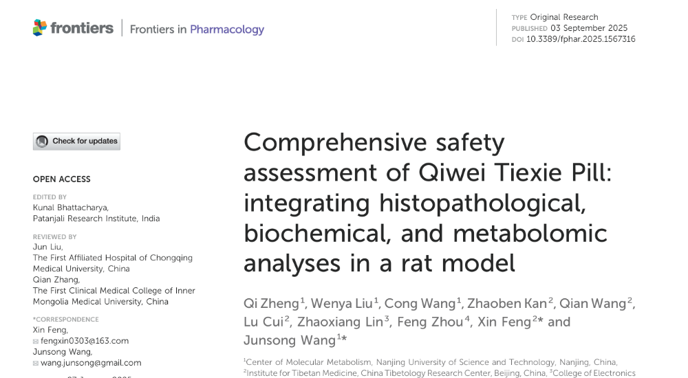 近日,中国藏学研究中心藏医药研究所与南京理工大学分子代谢中心等单位合作,对常用藏药七味铁屑丸开展安全性评价研究,相关成果以“Comprehensive safety assessment of Qiwei Tiexie Pill: integrating histopathological, biochemical, and metabolomic analyses in a rat model”为题,在国际期刊《Frontiers in Pharmacology》(SCI IF=4.8,药理学与药学,JCR分区Q1)公开发表。中国藏学研究中心冯欣研究员与南京理工大学汪俊松教授为共同通讯作者。