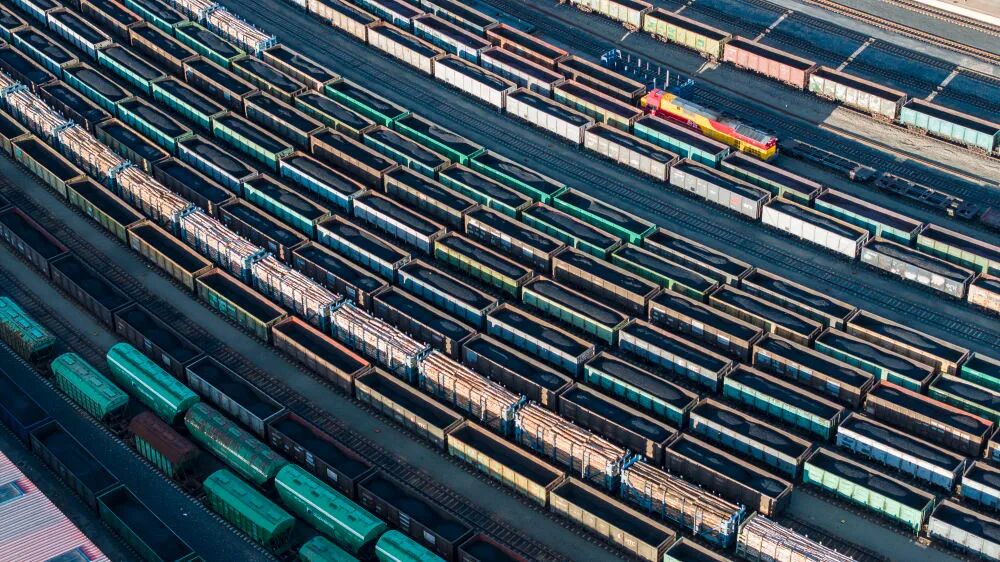 2025年10月18日,在中国铁路哈尔滨局集团有限公司绥芬河站南场,满载进口货物的列车等待解体换装(无人机照片)。新华社发(曲艺伟摄)