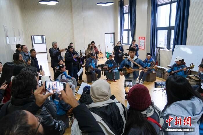 10月28日,拉美18个国家的21名记者、编辑等媒体从业者在西藏自治区林芝市巴宜区中学参访,观看师生们演奏藏族扎念琴。中新社记者江飞波摄
