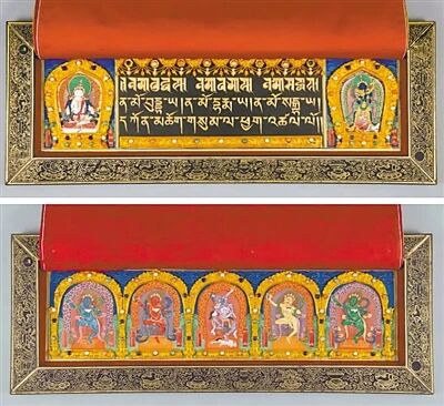此外,每函佛经还附有实木胎外贴磁青纸内护经板一对,上、下内护经板背面挖有凹槽,上面装饰有五彩缂丝经帘、金字打造的欢门、璎珞与莲瓣,镶嵌有青金石、珊瑚、松石、东珠等各种珍宝,并绘制了各种彩绘尊像。最后,这些佛经再用彩色的线织绦带、黄缎经袱、黄绸经袱、黄棉夹袱层层包裹。