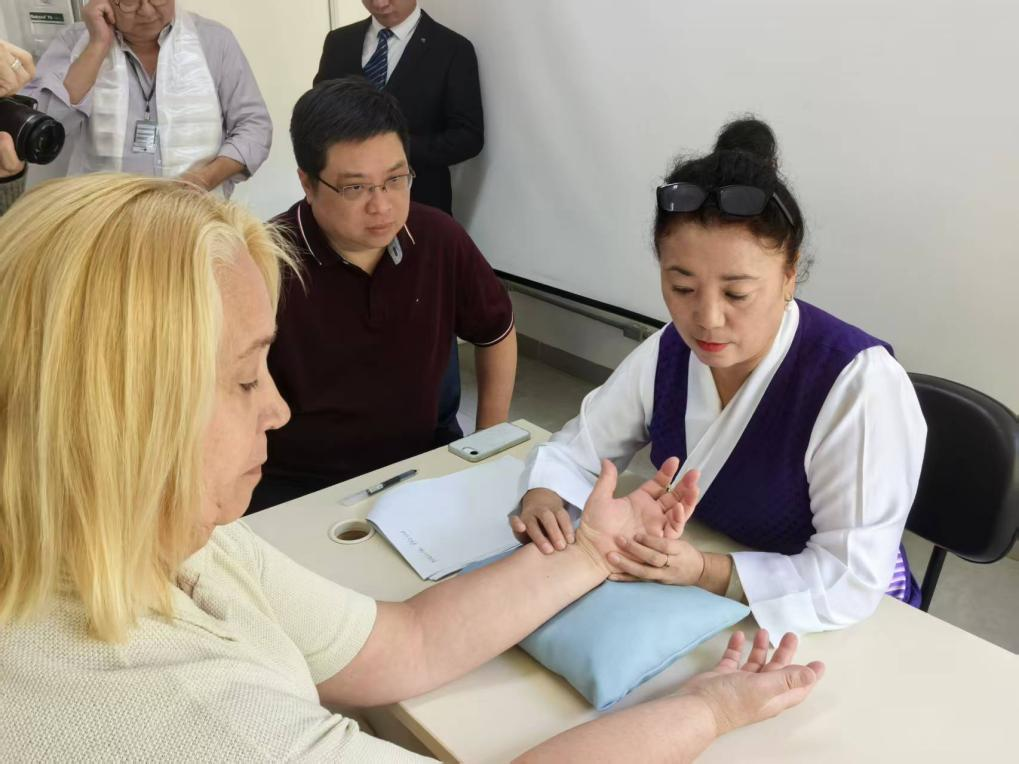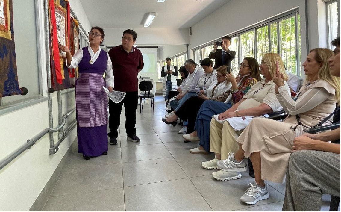 代表团一行赴圣保罗市政府传统医学局进行交流访问。代表团成员冯欣、肖维霖、赛藏分别以“藏医药在肝病治疗中的科学探索研究”“高质量发展的西藏”“域外文明的摆渡者——俄·译师洛丹喜饶”为题作报告。随后举办的藏医曼唐展览成为现场亮点,展出的4幅珍贵藏医曼唐生动呈现藏医生命树、诊断树、治疗树、胚胎图等核心内容,让巴西民众直观感受藏医药的学术内涵与艺术魅力。交流会后组织的藏医义诊活动反响热烈,藏医副主任医师索金兰运用藏医脉诊为当地民众义诊,提供健康咨询,现场排起长队,脉诊的准确性获得患者一致认可。
