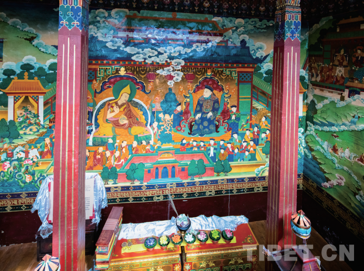 图为五世达赖喇嘛故居内的壁画——清顺治皇帝接见五世达赖喇嘛