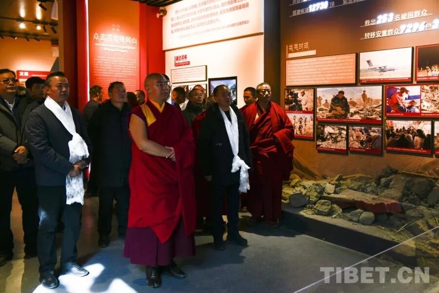图为第十一世班禅额尔德尼·确吉杰布在定日县6.8级地震受灾影响最严重的村庄之一森嘎村村史馆调研灾后重建情况。摄影:赵振宇