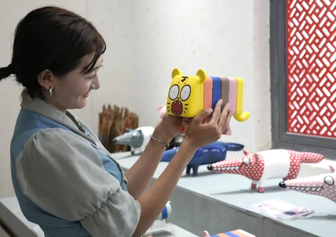 2025年8月6日,西藏拉萨莲华之宝中华藏瓷文化旅游体验园景区里,工作人员展示卡通陶瓷工艺制品。该体验园集展览、销售与文化体验于一体,通过与高校开展校企合作等方式,将唐卡绘画艺术与陶瓷工艺结合,传播优秀传统文化。中新社记者李林摄