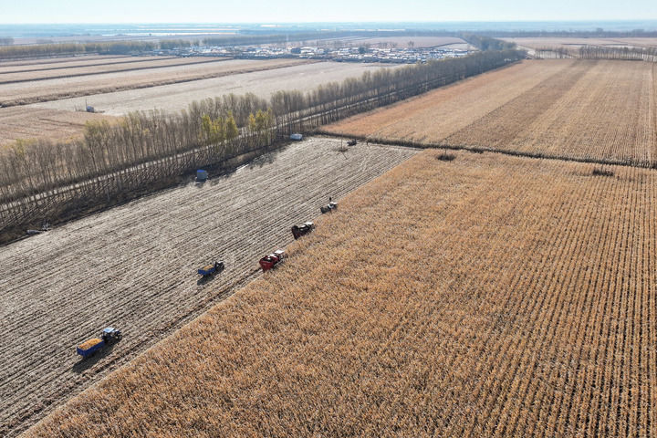 2024年10月16日,在黑龙江省肇东市五里明镇东升村,农民驾驶农机进行收割作业(无人机照片)。新华社记者谢剑飞摄