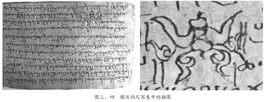 镇伏讷尺的写卷中有一幅恶鬼肖像插图,这种形象在后期藏文文献中被称为“灵噶(ལིངྒ)” 。该图像位于写卷第27页第2行至第3行左侧。图中恶鬼头部束有顶髻,面部呈圆形,双臂高举,双腿叉开,身上似乎缠绕着绳索(图三、四)。类似的图像在都兰县考肖图遗址(图五)和青海宗日遗址出土的兽骨上亦有所见。此外,察秀塘遗址出土的马头骨(03QZCXTJ2:16)上残留有墨绘的两道圆弧,圆弧内外及其间均绘有古藏文,且隐约可见其他图案的残迹,推测可能为类似的恶鬼图像。