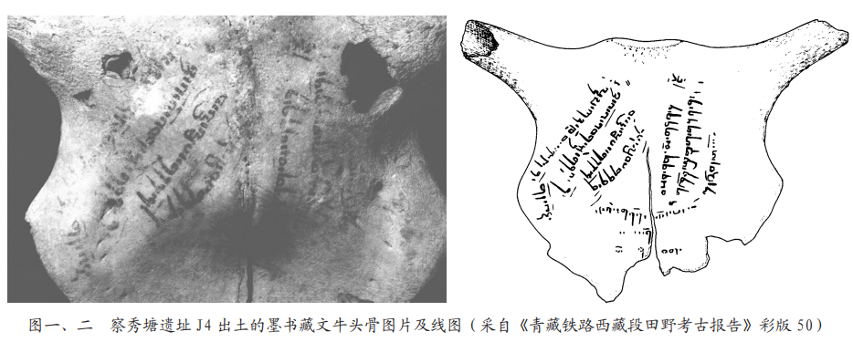 近年考古发现表明,与察秀塘遗址类似的遗存最早见于青海都兰县考肖图遗址。据已公布资料显示,该遗址出土的两件墨书古藏文兽骨具有重要研究价值。1号头骨上墨书古藏文“璆斯(ཇུ་སྲི)、灰马(རྟ་གྲོ)、业(ལས་སོ)、起尸(རོ་ལང)、乌木(འུམ)”等字样。2号头骨上面部分古藏文可释读为“□□朵斯镇压,灰马□,璆斯镇压(□□གདོ་སྲི་མར་མནན་རྟ་གྲོ་□ཇུ་སྲི་མར་མནན་)” 。值得关注的是,近年来在青藏高原中部和东部又相继发现3处类似的考古遗存。其中,西藏拉萨市林周县雅松察夏遗址的发掘简报已正式公布,简报中记录“西台之下人头骨和动物头骨一起出土、动物头骨上墨书藏文,形似藏文数字,其意不明,可能咒语。北台之下见两个人头骨,一具之上盖有半块石磨盘。……里层空间内出土陶灯数个” 。2020年,青海宗日遗址的发掘中,同样发现了一座遗迹。据部分已披露的资料显示:“H18内出土了一件牛肩胛骨,其上绘有墨色人像及古藏文咒语。” 2021年,同德县唐已改遗址“出土较多的动物头骨、人头骨、泥擦擦、铁器、青铜器和树皮等包含物,其中部分动物头骨上绘有墨书图案和古藏文咒语” 。