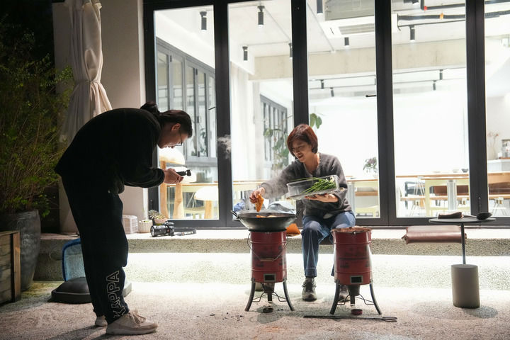 浙江省宁波市奉化区溪口镇东山村民宿主董凤洁(右)在民宿内拍摄炒年糕的短视频(2025年11月13日摄)。新华社记者黄宗治摄