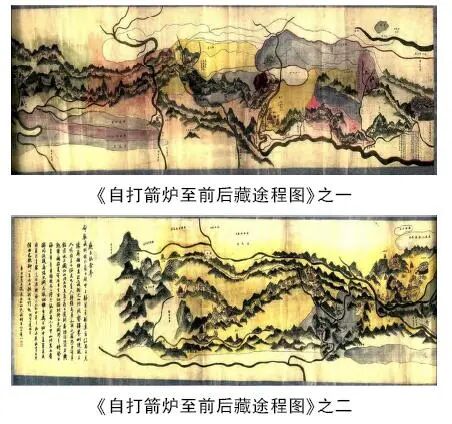 目前,在中国国家图书馆保存着一幅名为《自打箭炉至前后藏途程图》的清代西藏舆图,绢本设色,纵41.4厘米,横316.3厘米,图中未注比例,图末附有跋语,卷轴外侧用毛笔书写“自打箭炉至前后藏途程图一轴”。由跋语可知,此图系时任驻藏帮办大臣的安成所绘,绘制时间为清光绪二十七年(1901)正月。目前,在民族文化宫保存了一幅安成所绘《自打箭炉至前后藏途程图》的“清代摹绘本”,名为《清朝官员进藏路线图》,亦绢本设色,纵44厘米,横319厘米。除名称不同、无跋语外,两图尺寸相近,图中文字、画法和图形走势相同。