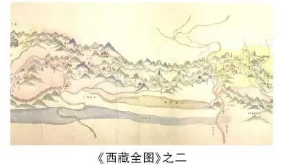 北京大学图书馆藏清代彩绘地图《西藏全图》,绘制者不详,《皇舆遐览》中将其绘制时间确定在清道光元年至宣统三年(1821—1911)之间,时间跨度达到90年。《全图》具有我国古代彩绘地图的一般特征,整幅图以鸟瞰式移点透视法绘制,色彩鲜明,绘制精美。目力所及,皆位于图中景物的侧前方甚至是正上方,近处的景物不大,远处的景物不小,绵延数千里的距离,各种景物几乎都保持着相同的大小尺寸,但由于无比例尺,方位、比例的绘制很不准确,故图中地名大多只具象征意义,非实际距离。《全图》绘制的方位上北下南、左西右东,绘制区域以西藏为主,东起四川西部的打箭炉(今康定),西至后藏的济隆、聂拉木一带;北面辐射与西藏毗邻的青海、新疆等地,远及俄罗斯;南面、西面以雪岭(喜马拉雅山脉)为界,所及包括廓尔喀、哲孟雄、布鲁克巴、克什米尔等周边国家和地区。