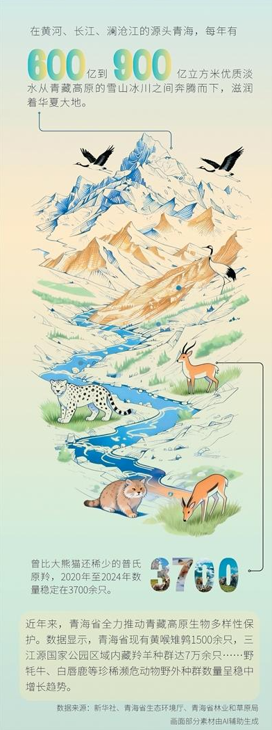 随着野生动植物栖息环境持续改善,青海省珍稀物种种群呈稳步恢复态势,生物多样性家底持续夯实。截至目前,三江源国家公园区域内,雪豹约1000只,藏羚羊种群达7万余只,野牦牛1万余头,藏野驴3万—4万头,白唇鹿1万余只。