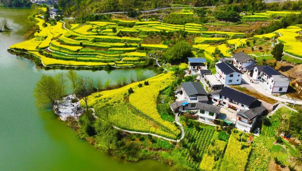 重庆市黔江区阿蓬江镇大坪村油菜花开放(2026年3月4日摄,无人机照片)。新华社发(杨敏摄)