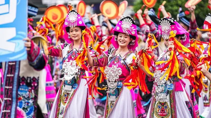 ▲2025年5月18日,贵州民族团结大巡游活动在贵州省贵阳市举行。来自贵州省9个市(州)的3600余人组成26个特色方阵,集中展示贵州的民族文化和时代风尚,图为六盘水方阵的表演队伍在进行巡游。新华社记者陶亮摄