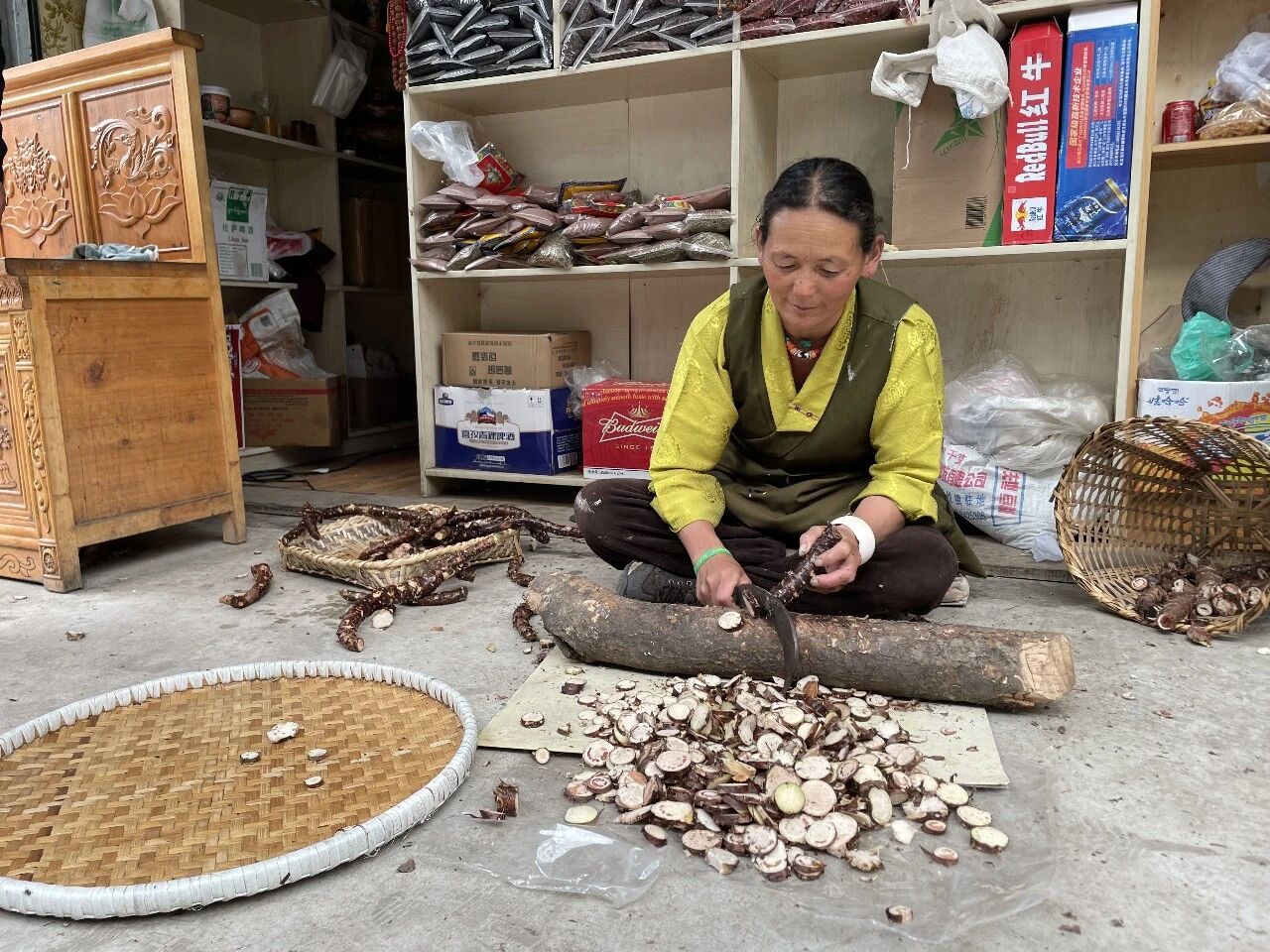 村民在处理红景天药材