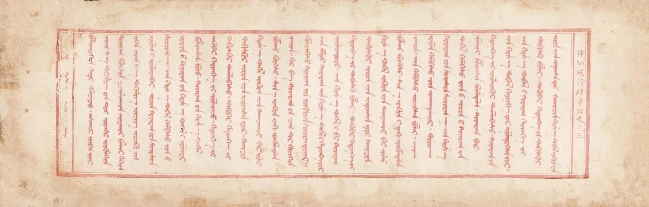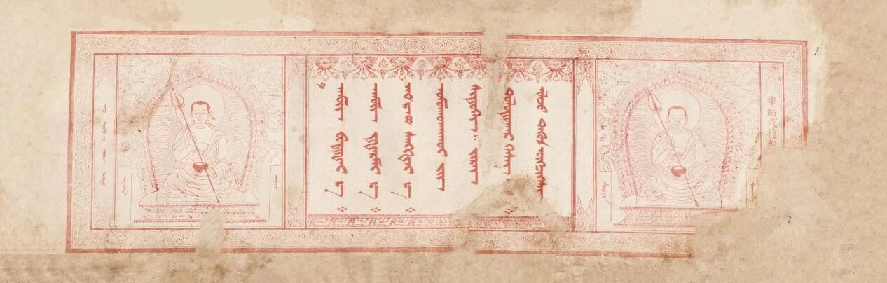 康熙五十九年(1720)版刻完成,朱砂刷印、版式宏阔,被称为朱砂本或御制本,成为蒙古文《甘珠尔》的权威版本。蒙古文《甘珠尔》刊刻完成后,由理藩院统一掌管分发事宜。清廷常常借蒙古王公入京“年班朝觐”的机会,将经典赐予各旗札萨克或寺庙僧侣。乾隆二十六年(1761)以后,原由妙应寺喇嘛印行的蒙古文《甘珠尔》《丹珠尔》改由武英殿刊刻,并通过理藩院向蒙古各部颁行。