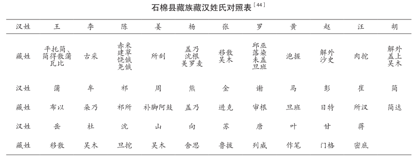 汉藏交融亦可从藏族同胞受内地姓氏文化影响、出现藏族汉姓的现象中得到体现。据地方志记载,藏族先民原无姓氏,自明代在涉藏地区推行土司制度以来,川边涉藏地区出现土司取汉姓的情况。如雅州天全正、副土司投诚后分别采用汉名高国英、杨藏卜。康雍乾时期,川边土司多取汉姓:泸定冷边、咱里土司采“周”“古”等汉姓,冕宁安宁河流域的土司亦多采用汉姓。康定鱼通、明正与宝兴穆坪土司均使用汉姓“甲”。据《盐源县志》,木里土司自“项拈查”(1781年袭职)开始,历代土司虽有藏名“琼玖”“札史”“克珠”等名,但皆采用汉姓“项”,形成了“汉姓藏名”的取名方式,显示出典型的汉藏融合特征。晚清赵尔丰在川边实施改土归流时,“为教民办族,撰定百字为姓,以别世系”,进一步推动了康区藏族取汉姓现象的发展,九龙、丹巴、甘孜、巴塘及川西北藏区的土司皆采用汉姓。川西北四土司在嘉庆年间仍用藏名,至晚清民初则使用汉名“索观瀛”“泽材海”“桑福田”“高承让”等,其他土千户、把总等亦多采汉名。康定、甘孜、巴塘一带出现王益西志玛、陈格勒等汉姓藏名。雅安石棉境内,“平托”“古采”“赤米”“移散”“移散”等藏族姓氏对应的汉族姓氏为“王”“李”“陈”“姜”“杨”“张”“罗”“黄”“赵”“汪”“胡”“蒲”“牟”“祁”“周”“熊”“金”“谢”“马”等(见下表),足见汉藏姓氏文化的深度交融。