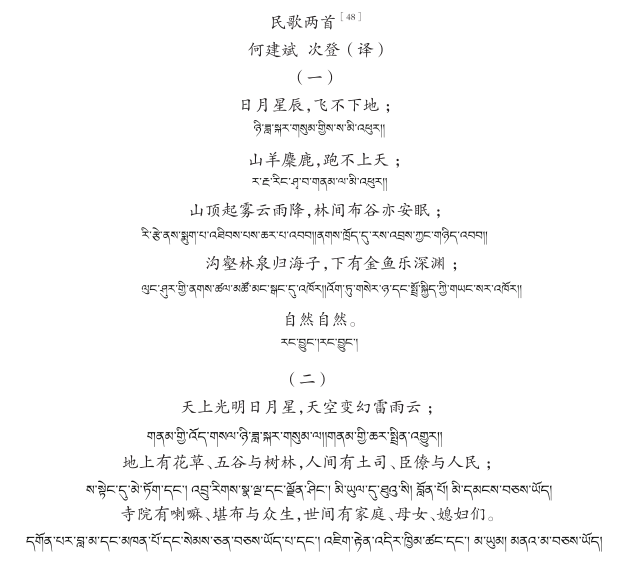 此外,藏、彝历法亦受到汉族文化的影响,反映出各民族在长期交往交流中的文化互动。据杨仲华记载,“西康历法分喇嘛历与阿湼历。其纪年方式均不用天干,而用十二地支之十二生属编为通历”,体现汉族十二地支与生肖文化对西康历法的影响。《西康综览》记载彝族历法采用十二支记日,子丑寅卯依次排列,鼠、牛、虎、兔、龙、蛇、马、羊、猴、鸡、狗、猪对应各日,周而复始,与汉族历法一致。可见,彝族历法亦受到汉族十二地支文化的影响。任乃强《西康图经·打箭炉岁时记》亦载,“炉城夷民通用阴历,与汉人同”。可见,姓氏取用与历法制度均体现了汉藏文化的交融与互动。近代康区地方志记载了民国后期汉藏知识分子合作翻译藏族民歌、传承汉藏文化的事例。据《西康省白玉县乡土地理志略》记载,1941年,汉族知识分子何建斌与藏族人士次登通力合作,以汉文和藏文共同翻译了两首藏族民歌,原文如下: